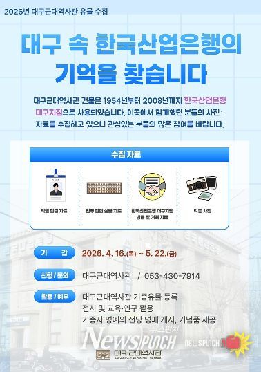 뉴스펀치 조평훈 기자 | 대구문화예술진흥원 박물관운영본부 소속 대구근대역사관은 4월부터 5월 중순까지 한국산업은행 관련 자료를 수집하는 기증 운동을 전개한다.