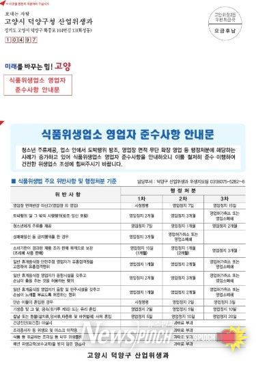 덕양구 관계자는 “이번 안내문 배부를 통해 식품위생법 주요 위반사항과 변경된 규정을 적극 안내하고, 영업자의 위생관리 역량을 높이고자 한다”며 “기온 상승으로 식중독 발생 위험이 높아지는 시기인 만큼 예방 수칙 홍보를 병행해 안전한 식품위생 환경 조성에 최선을 다하겠다”고 밝혔다.
