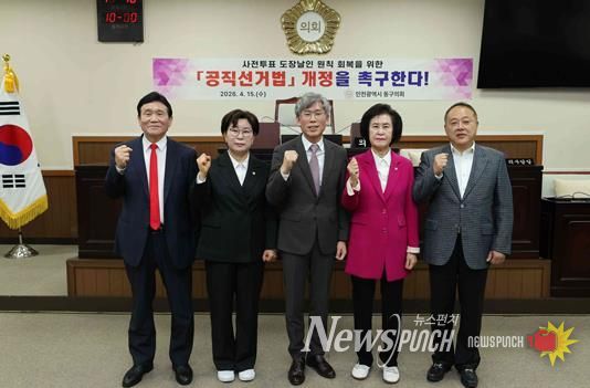 뉴스펀치 정홍균 기자 | 인천 동구의회는 지난 15일 열린 제291회 임시회 제1차 본회의에서 최훈 의원이 대표 발의한 『사전투표 도장날인 원칙 회복을 위한 공직선거법 개정 촉구 결의안』을 재석의원 7명 중 5명의 찬성으로 채택했다.