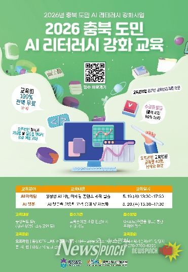 뉴스펀치 이현승 기자 | 충청북도와 충북과학기술혁신원(원장 고근석)은 AI 일상화 시대에 대응하여 도민의 인공지능(AI) 활용 역량을 강화하기 위해 오는 5월 19일, 5월 20일 '2026 충북 도민 AI 리터러시 강화 교육'을 추진한다고 밝혔다.