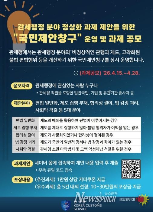 이명구 청장은 “국민과 기업, 현장 공무원이 함께 참여하여 관세행정에 숨겨진 문제를 발굴하고 실질적으로 개선하는 것이 이번 프로젝트의 핵심”이라며, “관세행정 전반의 비정상을 바로잡아 공정한 경제질서 확립과 국민 신뢰 제고에 기여하겠다”고 밝혔다.