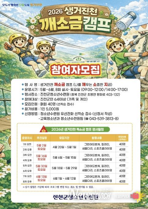 뉴스펀치 이현승 기자 | 충북 진천군은 관내 청소년과 가족이 함께 참여할 수 있는 체험활동과 인증 수련 프로그램을 제공하기 위해 ‘2026 생거진천 깨소금 캠프’ 참가자를 모집한다고 밝혔다.