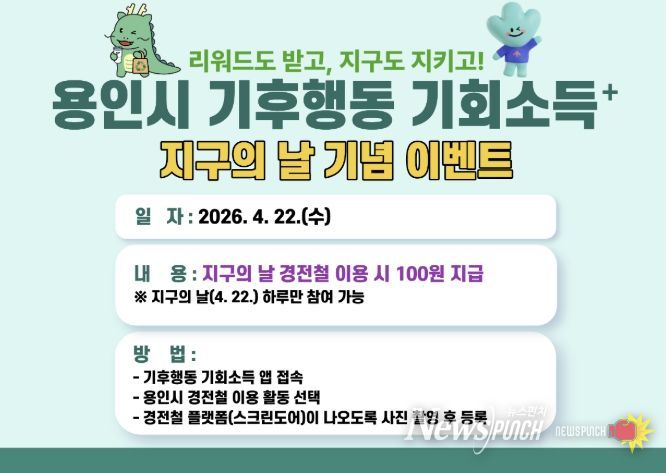 뉴스펀치 박상훈 기자 | 용인특례시는 4월 22일 지구의날을 중심으로 1주간 진행되는 기후변화주간(4.20~26)을 맞아 시민이 참여하는 체험·교육 프로그램과 탄소중립 실천 이벤트를 운영한다고 16일 밝혔다.