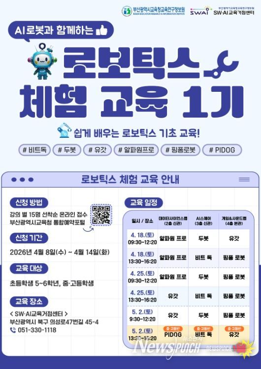 뉴스펀치 김윤걸 기자 | 부산광역시교육청교육연구정보원은 오는 18일부터 5월 2일까지 6회에 걸쳐 부산SW·AI교육거점센터에서 초등 5~6학년, 중·고등학생 90명을 대상으로 ‘AI로봇과 함께하는 로보틱스 체험 교육’을 운영한다.