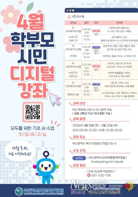 뉴스펀치 김윤걸 기자 | 부산광역시교육청교육연구정보원은 오는 18일과 25일 부산SW·AI교육거점센터에서 성인들과 아이들을 대상으로 ‘4월 시민 디지털 강좌’를 운영한다.