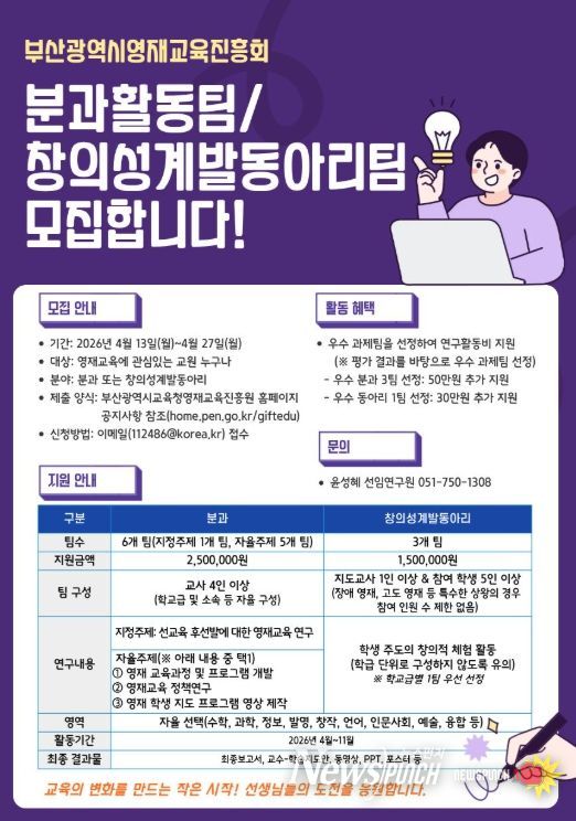 뉴스펀치 김윤걸 기자 | 부산광역시교육청영재교육진흥원은 오는 27일까지 영재교육에 관심 있는 교원을 대상으로 ‘2026년도 영재교육진흥회 연구과제 팀’을 공개 모집한다.