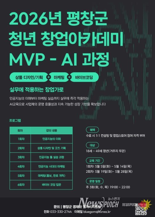 뉴스펀치 조평훈 기자 | 평창군은 강원특별자치도 공모사업인 '2026년 지역산업 맞춤형 일자리 창출 지원사업'으로 ‘청년 창업아카데미(MVP)-AI 과정’을 본격적으로 운영한다.