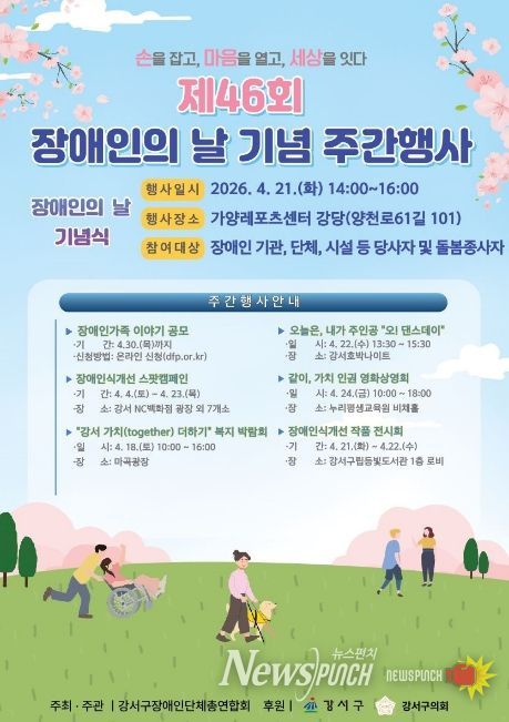 뉴스펀치 박상훈 기자 | 서울 강서구는 4월 20일 장애인의 날을 맞아, 오는 18일부터 일주일간 ‘제46회 장애인의 날 기념 주간행사’를 개최한다고 밝혔다.