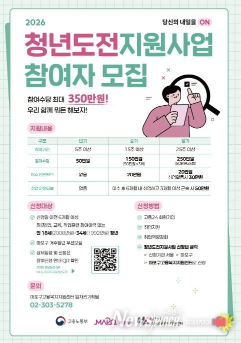 뉴스펀치 박상훈 기자 | 마포구가 구직단념청년의 사회 재진입을 돕는 ‘청년도전지원사업’ 규모를 130명으로 확대하며 지원을 강화한다.