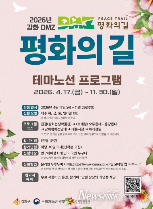 뉴스펀치 정홍균 기자 | 강화군은 오는 4월 17일부터 11월 30일까지 비무장지대(DMZ) 인근을 따라 조성된 ‘DMZ 평화의 길 테마 노선’ 프로그램을 본격적으로 운영한다고 밝혔다.