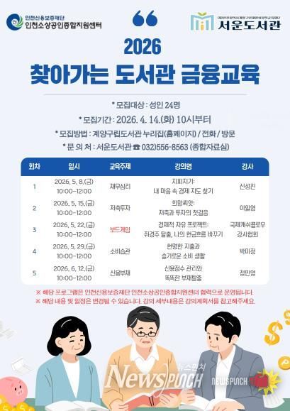 뉴스펀치 정홍균 기자 | 인천시 계양구 서운도서관은 지역주민의 실생활 금융역량 강화를 위해 오는 5월 8일부터 6월 12일까지 성인을 대상으로 ‘2026 찾아가는 도서관 금융교육’을 운영한다고 밝혔다.