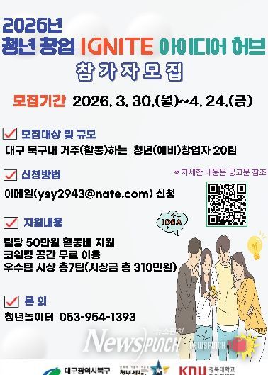 뉴스펀치 조평훈 기자 | 대구 북구청은 지역 청년들의 창업 열정과 혁신적인 아이디어 발굴을 지원하기 위해 오는 4월 24일까지 '청년 창업 Ignite 아이디어 허브' 참가자 20팀을 모집한다.