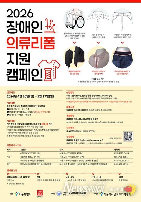 의류리폼 신청은 4월 20일부터 5월 17일까지 장애인의류리폼지원캠페인 누리집에서 가능하며, 최종 대상자에게는 5월 말 개별 연락할 예정이다. 기타 자세한 내용은 장애인의류리폼지원캠페인 누리집에서 확인하면 된다.