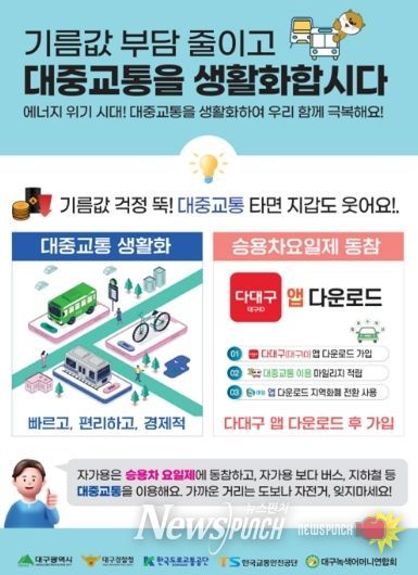 뉴스펀치 조평훈 기자 | 대구광역시는 중동발 에너지 위기가 지속됨에 따라 에너지 절약 분위기를 확산하고 시민들의 동참을 이끌어내기 위해 ‘범시민 대중교통 이용 활성화 캠페인’을 전개했다.
