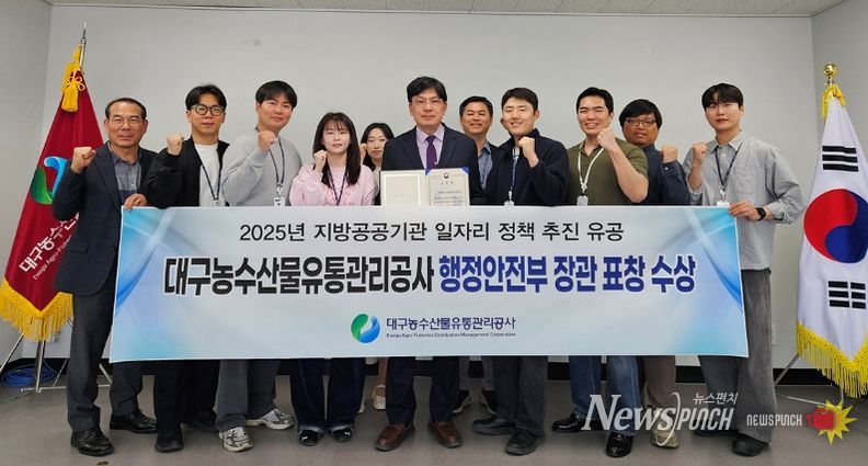 뉴스펀치 조평훈 기자 | 대구농수산물유통관리공사는 지역사회 양질의 일자리 창출 및 고용 개선에 기여한 공로를 인정받아 ‘지방공공기관 일자리 정책 추진 유공’ 분야 행정안전부 장관 표창을 수상했다.