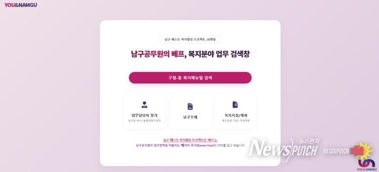 뉴스펀치 김윤걸 기자 | 부산 남구는 복지행정의 업무 효율성을 높이고 민원 응대 품질을 개선하기 위해 남구 베스트 복지행정 프로젝트인 ‘베프 AI챗봇’을 4월 중 구축하고 시범운영을 시작했다고 밝혔다.