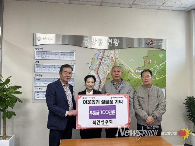 최명희 중앙동장은 “축제의 즐거움을 나눔으로 승화시켜 주신 북안심우회에 깊은 감사를 드린다”며 “기탁해 주신 후원금은 이웃을 위해 소중히 사용하겠다”고 말했다.