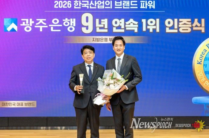 뉴스펀치 김용희 기자 | 광주은행은 16일, 한국능률협회컨설팅(KMAC)이 주관하는‘2026 한국산업의 브랜드파워(K-BPI)’지방은행 부문 9년 연속 1위 선정에 따른 인증식을 개최했다고 밝혔다.