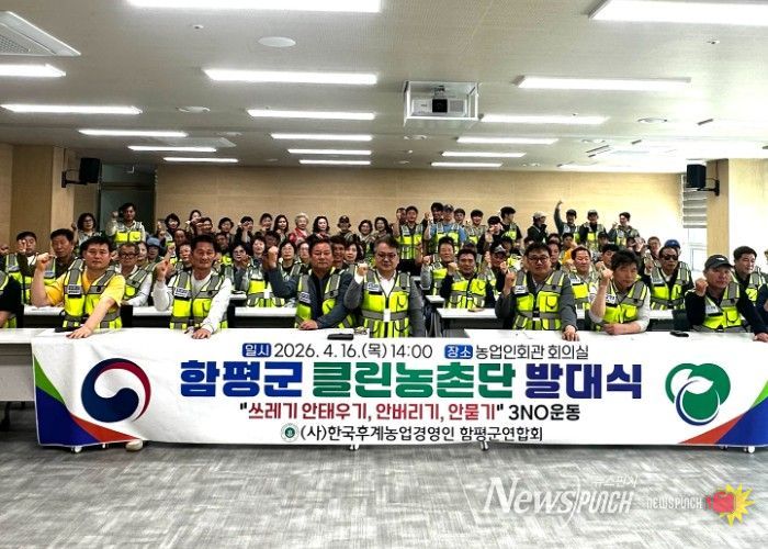 함평군은 16일 “이날 함평군농업인회관 회의실에서 (사)한국후계농업경영인 함평군연합회와 함께 주민 참여형 환경 정화 모델인 ‘클린농촌단’ 발대식을 개최하고 농촌 지역의 고질적인 쓰레기 문제 해결을 위한 3노(NO) 운동’ 실천을 선포했다”고 밝혔다.