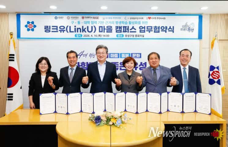 뉴스펀치 이현승 기자 | 대전 유성구는 16일 원신흥동·상대동·신성동 주민자치회와 목원대학교·대덕대학교가 ‘링크유(LinkU) 마을캠퍼스’ 업무 협약을 체결했다고 밝혔다.