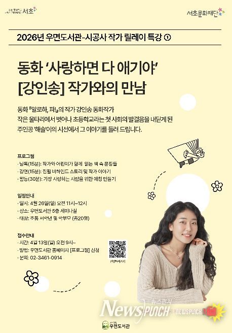 우면도서관이 출판사 시공사와 협력해 마련한 이번 특강은 최근 스마트폰 등 디지털 미디어에 익숙해진 아이들이 독서에 대한 심리적 장벽을 허물고, 작가와의 직접적인 만남을 통해 긍정적인 독서 경험을 쌓을 수 있도록 돕는 프로그램이다. 이달 26일과 다음달 10일 두 차례에 걸쳐 초등 저학년 어린이와 학부모를 대상으로 진행된다.