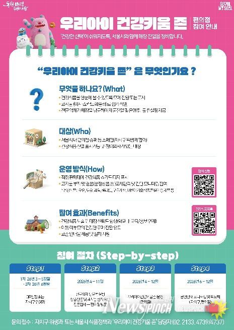 전담관리원은 점검과 함께 ’우리아이 건강키움 존‘ 포스터를 배부하는 등 사업 참여를 적극 안내할 예정이다. 참여를 신청한 업소에는 서울시와 계약한 전문업체가 방문해 건강식품 우선 진열과 표지물 설치를 지원한다.