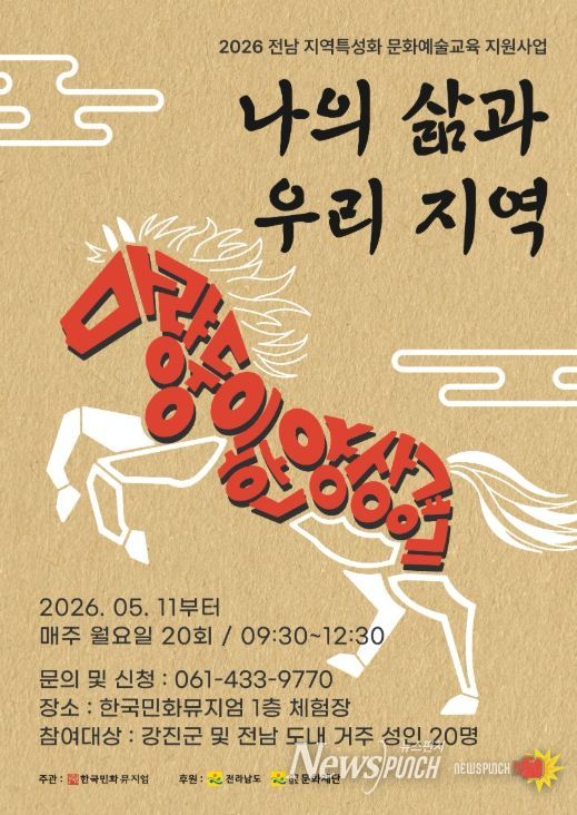 뉴스펀치 김용희 기자 | 강진군 대구면에 있는 한국민화뮤지엄이 ‘2026 지역특성화 문화예술교육 지원사업’ 선정에 따라 오는 5월 11일부터 ‘나의 삶과 우리 지역–마량둥이의 한양 상경기’ 프로그램 운영을 시작하며 참가자를 모집한다.