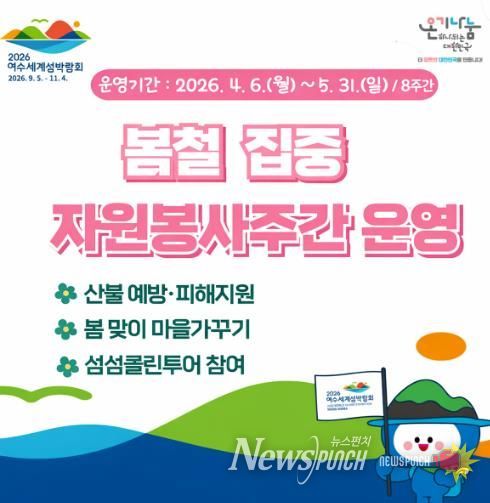 뉴스펀치 김용희 기자 | 여수시는 4월 6일부터 5월 31일까지 8주간 ‘봄철 집중 자원봉사주간’을 운영하고 온기나눔 캠페인을 추진한다고 밝혔다.