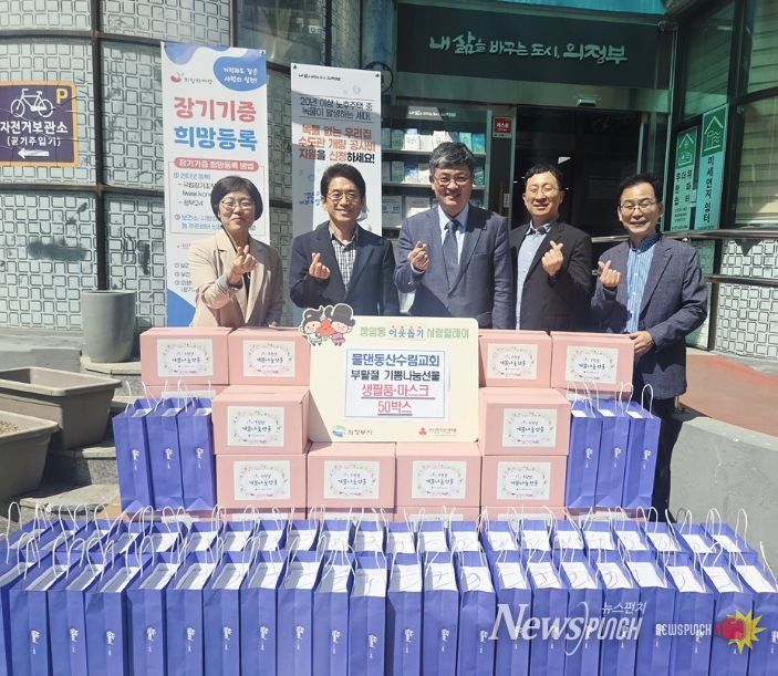 뉴스펀치 박상훈 기자 | 의정부시 장암동주민센터는 4월 16일 물댄동산수림교회가 부활절을 맞아 지역 내 어려운 이웃을 위해 ‘기쁨나눔선물 세트’와 마스크 50상자를 기탁했다고 밝혔다.