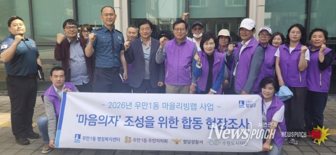뉴스펀치 박상훈 기자 | 수원시 팔달구 우만1동은 지난 15일, 보행 약자를 위한 '1분쉼표 마음의자 조성 사업' 설치 대상지 선정을 위해 관내 횡단보도 그늘막 설치구간에 대한 합동 현장조사를 실시했다.