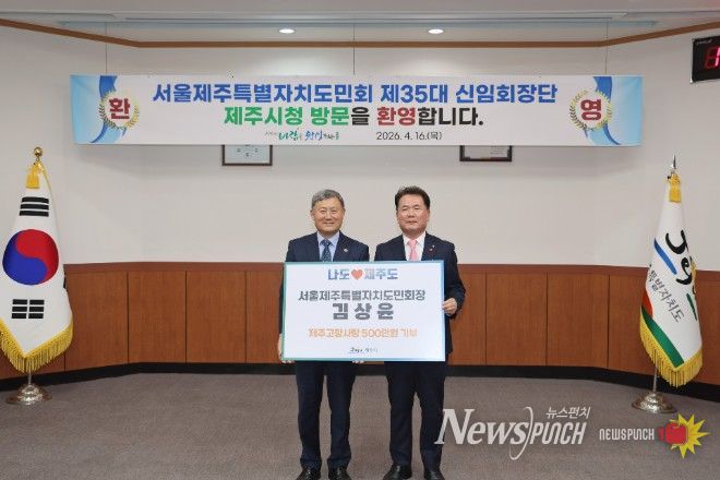 뉴스펀치 김용희 기자 | 김상윤 제35대 서울제주특별자치도민회장은 16일 제주시청을 방문해 고향사랑기부금 500만 원을 기탁했다.