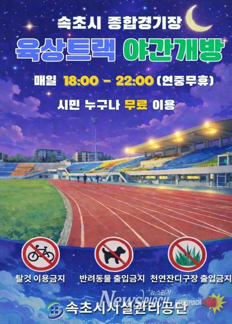 뉴스펀치 조평훈 기자 | 속초시시설관리공단(이사장 이선규)은 오는 4월 20일부터 노학동 종합경기장 내 육상트랙을 시민들에게 야간 개방한다고 밝혔다.