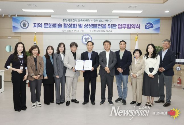 뉴스펀치 이현승 기자 | 충북 진천군과 진천교육지원청은 17일 진천교육지원청 온누리홀에서 ‘지역 문화예술 활성화와 상생발전’을 위한 업무협약을 체결했다고 밝혔다.