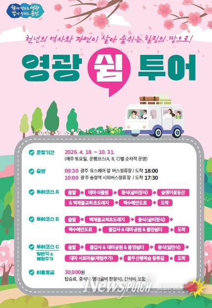 뉴스펀치 김용희 기자 | 영광군은 4월 18일부터 10월 31일까지(7∼8월 폭염으로 제외) 토요 감성 힐링 여행‘2026년 영광 쉼 투어’를 매주 토요일 운영 한다고 밝혔다.