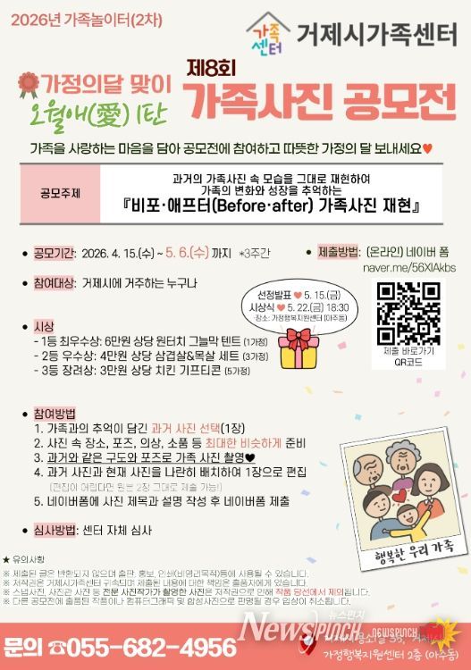 뉴스펀치 박세훈 기자 | 거제시가족센터가 5월 가정의 달을 맞아 가족의 소중함을 고취하고 가족친화 문화 조성을 위해‘2026년 제8회 가족사진 공모전’을 개최한다고 밝혔다.