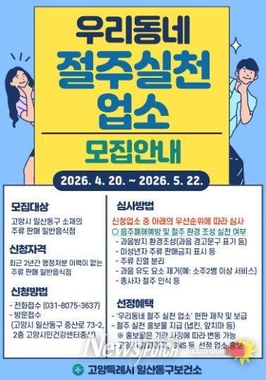 모집 기간은 오는 20일부터 5월 22일까지이며, 고양시 일산동구 소재 일반음식점 중 주류를 판매하는 업소를 대상으로 한다.