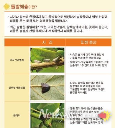대표적인 돌발 해충으로는 갈색날개매미충, 꽃매미, 미국선녀벌레 등이 있으며, 피해를 최소화하고 확산 방지를 위해 복숭아, 배, 사과, 포도 등 면적 792ha, 1,429호의 농가에 적용 약제를 공급한다.