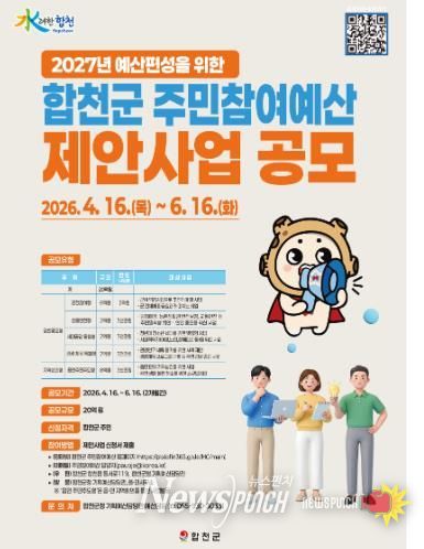 뉴스펀치 박세훈 기자 | 합천군은 2027년도 예산편성을 위한 주민참여예산 제안사업 공모를 6월 16일까지 실시하며, 올해부터 공모 분야를 기존 1개 모델 3개 유형에서 3개 모델 5개 유형으로 확대 개편한다고 밝혔다.