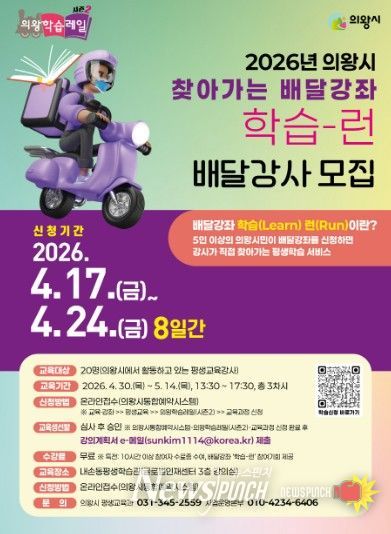 뉴스펀치 박상훈 기자 | 의왕시가 시민이 원하는 시간과 장소에 강사를 파견하는 맞춤형 평생학습 서비스인‘2026년 찾아가는 배달 강좌 학습-런(Run)’사업에 활동할 역량 있는 시민을 모집한다.