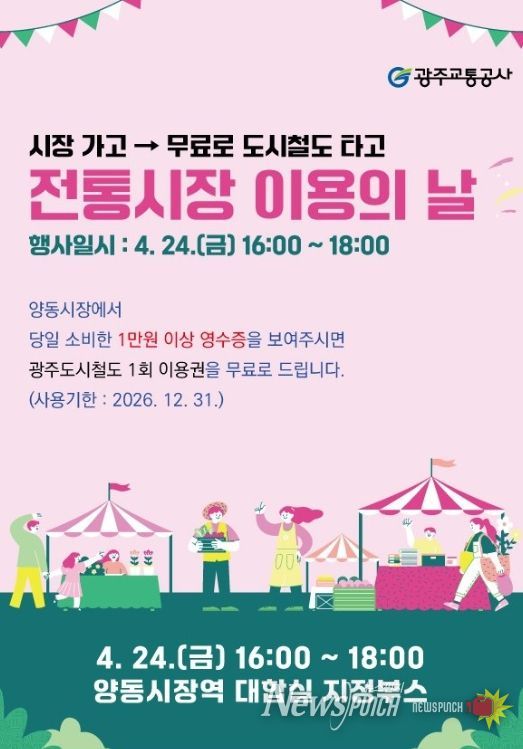 뉴스펀치 김용희 기자 | 광주교통공사가 지역 골목상권 활성화와 대중교통 이용 문화 확산을 위해 ‘전통시장 이용의 날’ 행사를 운영한다.