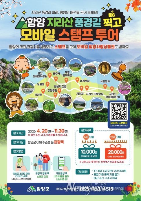 뉴스펀치 박세훈 기자 | 함양군은 함양의 대표 관광자원을 보다 쉽고 재미있게 즐길 수 있도록, 관광객 참여형 이벤트인 ‘함양 지리산 풍경길 찍고 모바일 스탬프 투어’를 운영한다고 밝혔다.