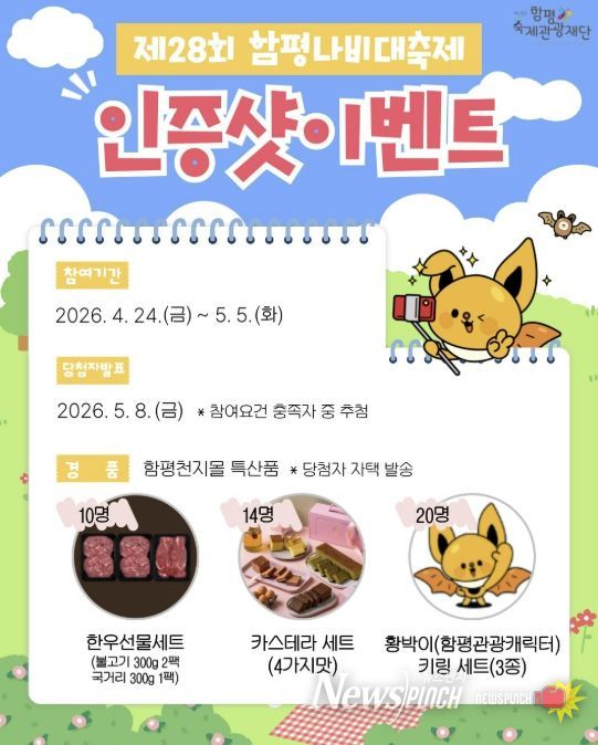 뉴스펀치 김용희 기자 | 전남 함평군이 제28회 함평나비대축제를 맞아 축제의 생생한 현장 분위기를 알리고 관람객의 참여를 확대하기 위해 SNS 인증 이벤트를 진행한다.