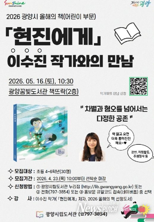 뉴스펀치 김용희 기자 | 광양시는 오는 5월 16일 오전 10시 30분 꿈빛도서관에서 ‘2026년 올해의 책’ 어린이 부문 선정 도서'현진에게'의 저자 이수진 작가를 초청해 강연을 연다고 밝혔다.