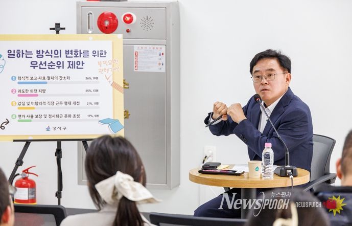 뉴스펀치 박상훈 기자 | 진교훈 강서구청장이 22일 수요일 주요 계약‧인허가 등 부패 취약분야 부서 직원들과 청렴 소통 간담회를 가졌다.