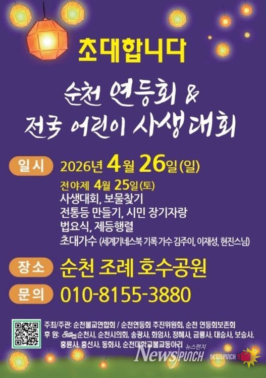 뉴스펀치 김용희 기자 | 불기 2570년 부처님 오신 날을 맞아, 순천의 밤을 자비의 등불로 수놓는 ‘2026 순천 연등회’가 오는 26일 조례호수공원 일원에서 화려하게 막을 올린다.