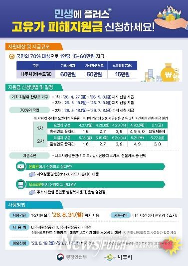 뉴스펀치 김용희 기자 | 전남 나주시가 중동전쟁으로 인한 고유가·고환율·고물가로 어려움을 겪고 있는 시민들의 생활 안정을 위해 고유가 피해지원금 1차 지급을 4월 27일부터 시작하며 최대 60만 원을 지원하고 찾아가는 신청 서비스를 운영한다.
