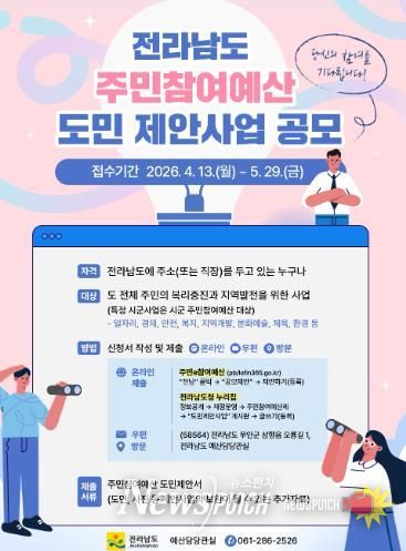 뉴스펀치 김용희 기자 | 전라남도는 2027년 예산 편성을 위한 주민참여예산 제안사업 공모를 5월 29일까지 진행한다고 밝혔다.