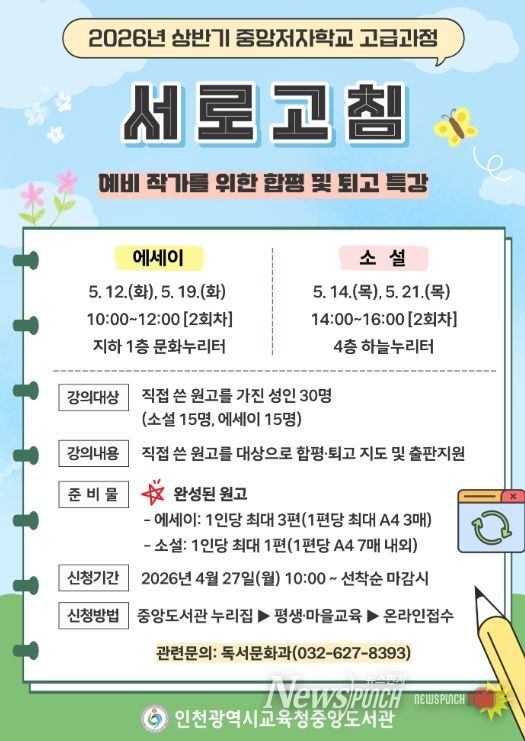 뉴스펀치 정홍균 기자 | 인천광역시교육청중앙도서관은 4월 27일부터 예비 작가를 위한 ‘중앙저자학교 고급과정’ 참여자를 모집한다.