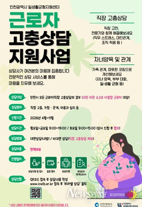 뉴스펀치 정홍균 기자 | (재)인천여성가족재단 인천 일생활균형지원센터는 근로자의 직장 내 고충 해소와 건강한 일생활 균형 실현을 위해 '근로자 고충상담 지원사업' 상담 신청 접수를 4월부터 시작했다고 밝혔다.