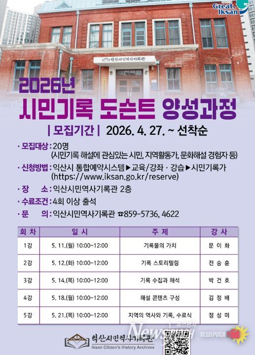 뉴스펀치 정홍균 기자 | 익산시가 지역의 역사와 민간 기록물을 시민의 목소리로 생생하게 전달할 '시민기록 도슨트' 양성에 나선다.